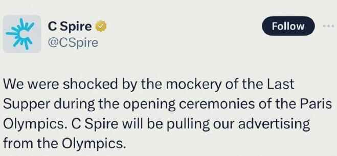 巴黎奥运会赞助商之一、美国科技公司C Spire在社交媒体上宣布,因为开幕式对基督教和宗教的不尊重(提及了《最后的晚餐》),将撤出自己在奥运会期间的所有广告。