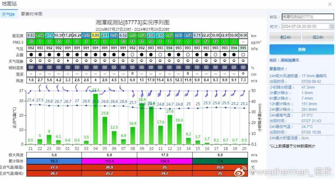 中国天气网气象分析师于群表示,湖南最强降雨时段集中在27日20时至28日20时,湖南长沙、湘潭、双峰、衡东均出现特大暴雨,降雨强度历史罕见。其中,湖南湘潭出现了破纪录的特大暴雨,降雨量281.6毫米,也是当地观测史首次出现特大暴雨。