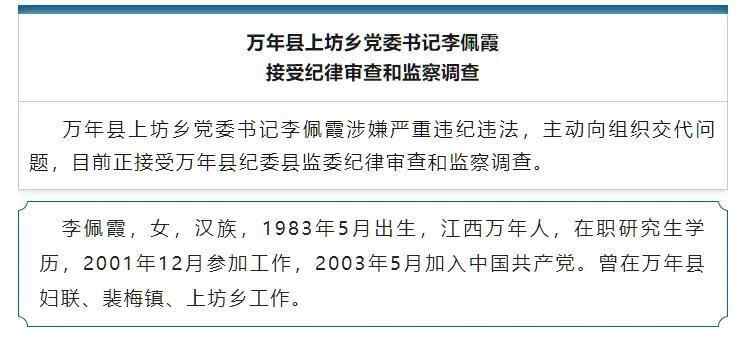 记者注意到,6月17日,上饶市纪委监委官方微信公众号曾发布李佩霞被查的消息。消息称,万年县上坊乡党委书记李佩霞涉嫌严重违纪违法,主动向组织交代问题,目前正接受万年县纪委县监委纪律审查和监察调查。