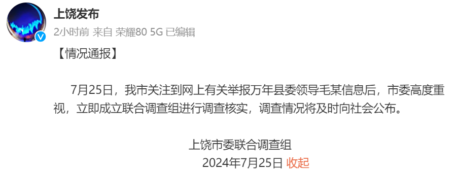 据上饶发布官博消息,7月25日,上饶市关注到网上有关举报万年县委领导毛某信息后,市委高度重视,立即成立联合调查组进行调查核实,调查情况将及时向社会公布。