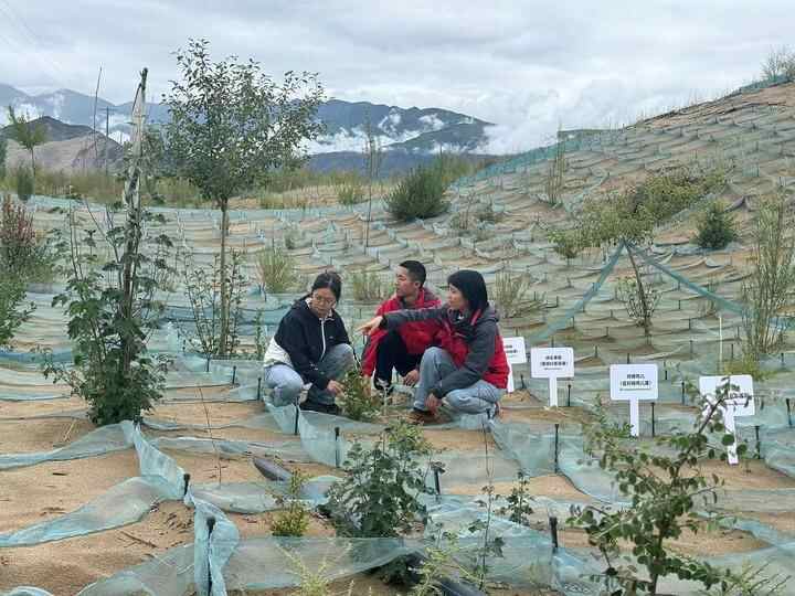 中国科学院成都山地灾害与环境研究所研究员周萍带领研究生在西藏扎囊县沙化土地生态治理综合示范区开展沙地试验样方植被生长状况监测。新华社记者 顾天成 摄