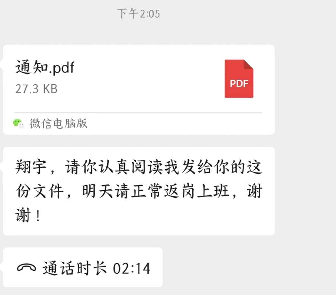 记者了解到,该返岗通知由孙静霞通过微信发送给马翔宇。在马翔宇提供的录音文件中,孙静霞表示“组织部门正在针对你(马翔宇)反馈的信息作全面的核实、核查,我们要求全体工作人员正常返岗上班、在岗,根据组织部门的需要及时配合相关情况核实、核查。”