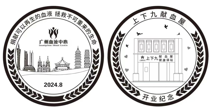 羊城晚报记者了解到,上下九献血屋开业纪念章直径50毫米,厚度2.5毫米,由紫铜制造,表面镀银。纪念章一面图案为广州极具特色的建筑代表,体现着创新、开放、包容的城市特色;另一面图案为上下九献血屋建筑场景图。