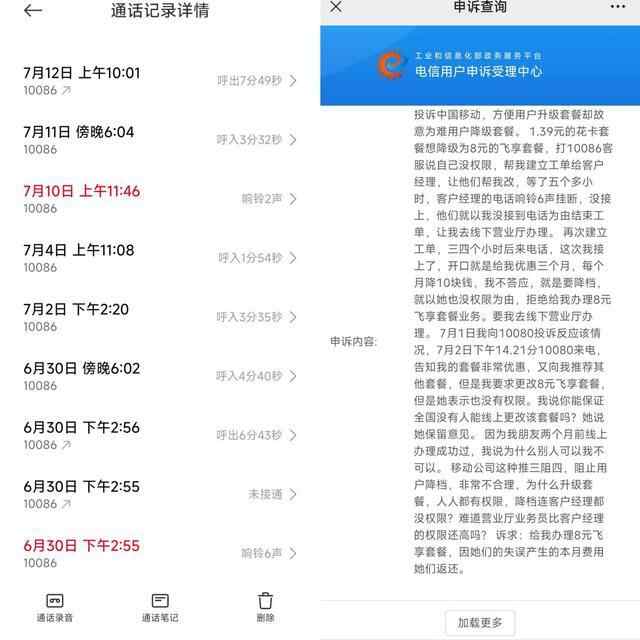 今年7月,广西南宁的陈先生也遇到了类似情况,客服反馈说其套餐签了两年合同,到期后才可更换。陈先生在中国移动APP、10086、黑猫投诉和工信部等多个渠道投诉后才得以变更。