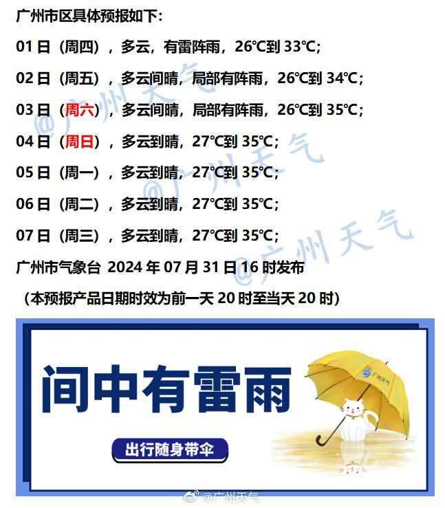 广州方面,受副高加强影响,8月1日起降水减弱,高温日渐明显,大家暂歇的空调又要重新启动了。当然,局地雷雨也不会完全消失,出门还是尽量带伞。