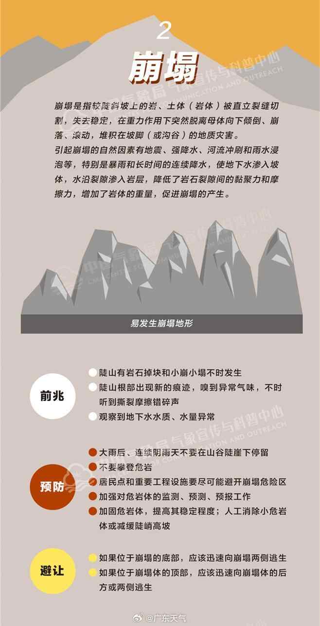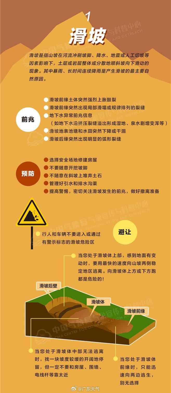 今明两天,肇庆、清远、云浮等部分市县地质灾害发生风险等级较高,需警惕山体滑坡、泥石流、塌方等灾害的发生。防御地质灾害,谨记五字经:“住前不住后,住上不住下,小雨不休息,大雨走亲戚!”