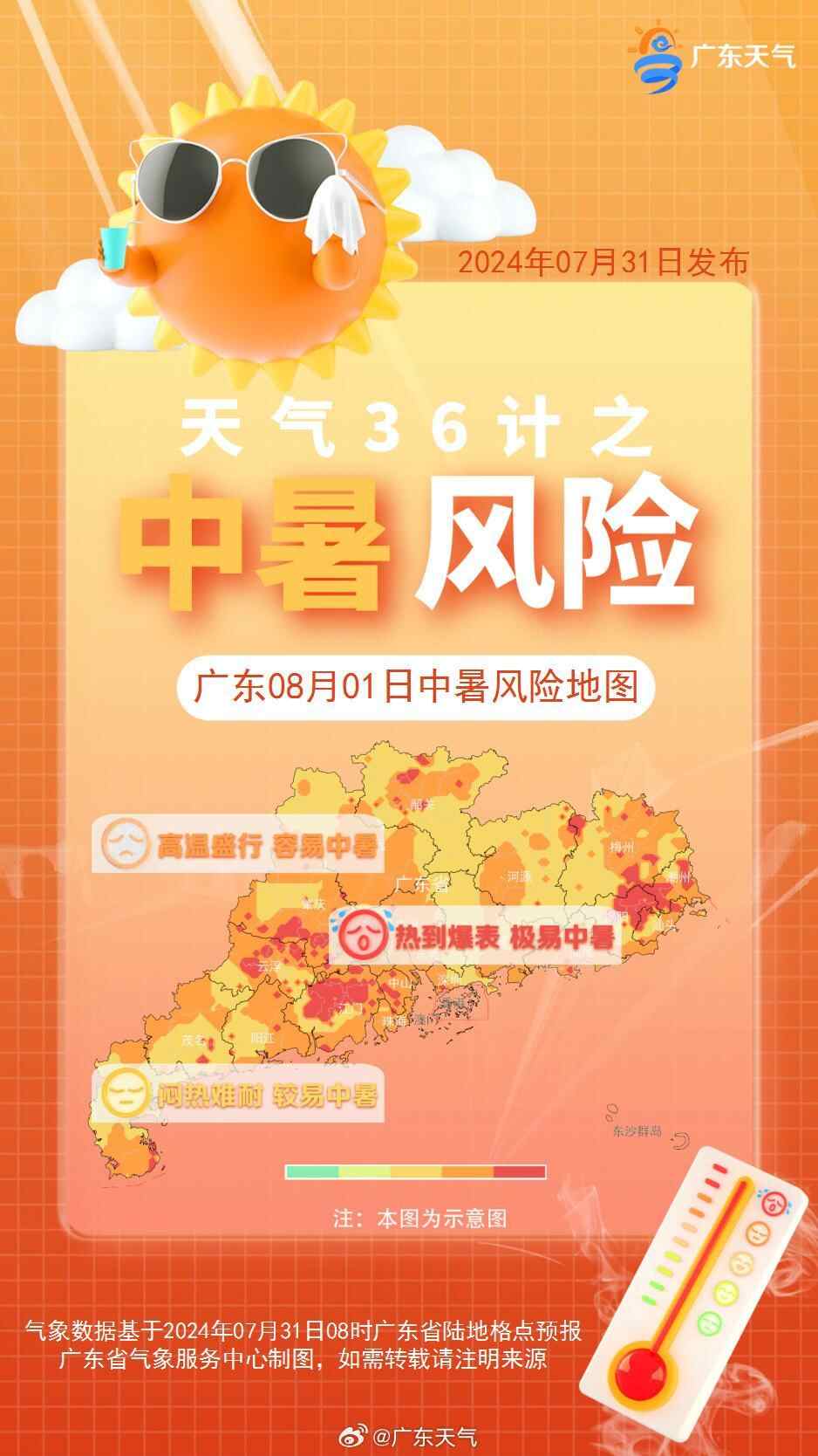 @广东天气 预计未来三天(8月1日-3日),广东多云为主,午后有分散或局部(雷)阵雨,渐转炎热天气。户外活动请注意关注临近预报预警信息,防暑防晒也要防局地雷雨。