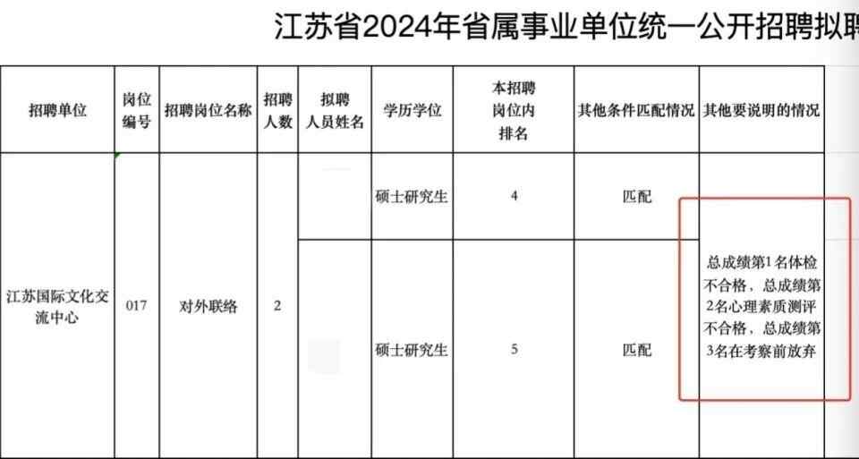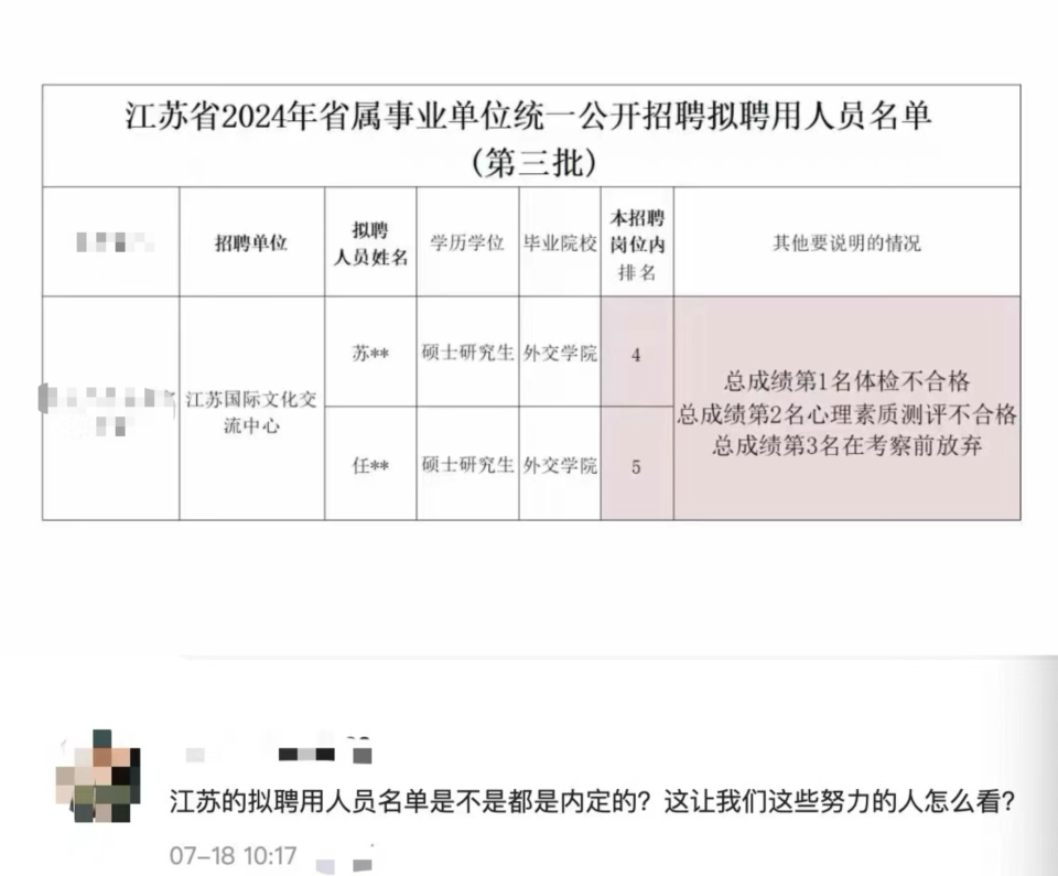 近日,随着“江苏省2024年省属事业单位统一公开招聘拟聘用人员名单公示(第三批)”的公布,其中有网友对江苏国际文化交流中心“对外联络(岗位编号017)”岗位的录取结果提出质疑,并发帖表示,是否存在内定情况?