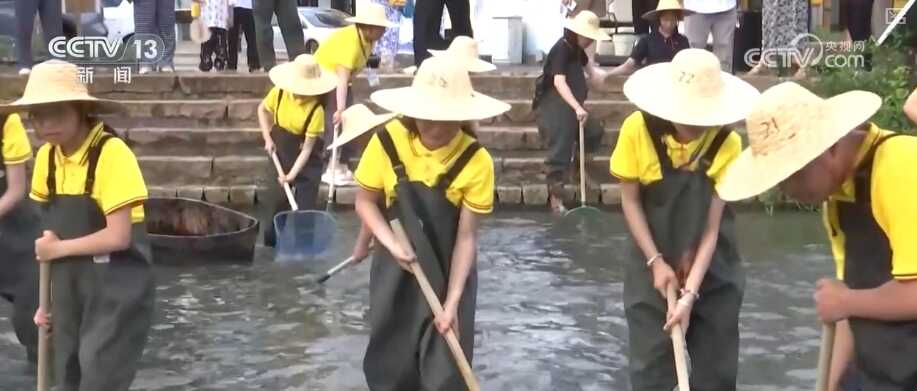 在浙江湖州市南浔区和孚镇荻港村“桑基鱼塘”捕鱼现场,鱼塘里,几十名学生身穿防水衣,手拿捕鱼网具,在池塘里耐心捕捞着,体会着古老的鱼塘文化。