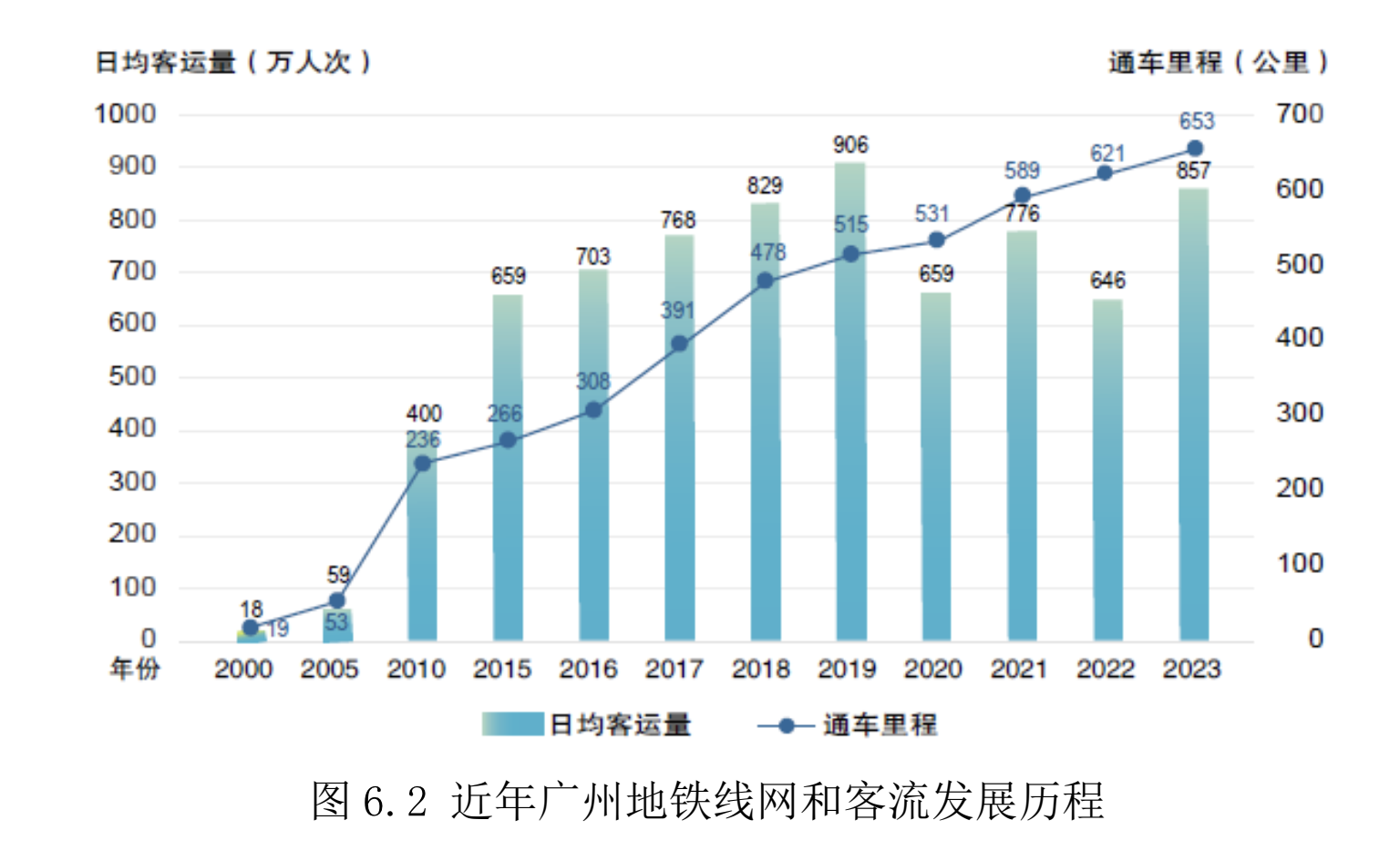 广州绿色出行居全国前列。中心城区绿色出行(含步行、自行车、电动自行车、常规公交、轨道交通)比例75%,居全国超大城市前列,其中骑行(自行车和电动自行车合计占比21%)持续增长。地铁通车里程653公里,日均客运量857万人次,恢复至2019年的95%,日客流强度1.38万人次/公里。地铁在市民认同方面走在全国前列,不仅服务于工作日通勤出行,也是休闲文旅的重要工具,休息日客流总量全国第一。