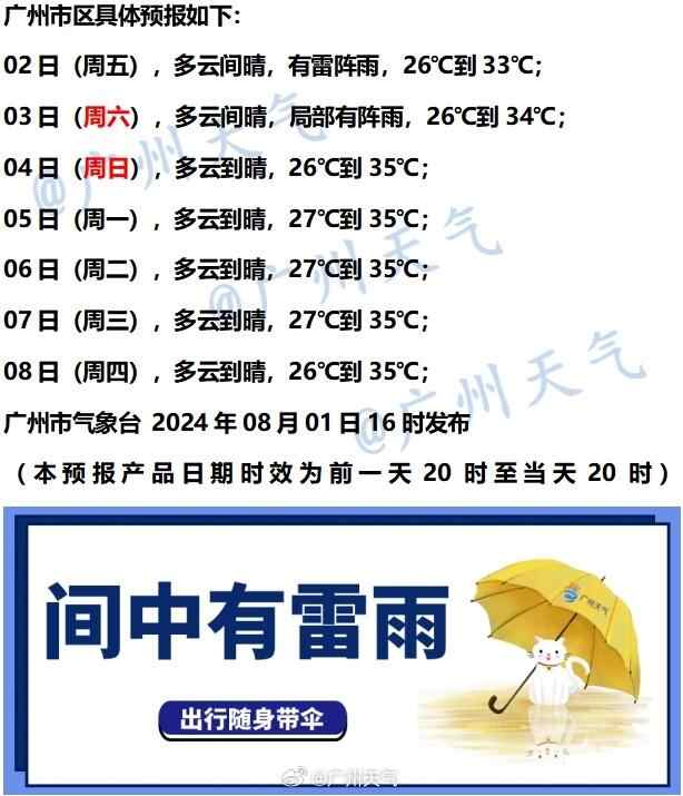 @广州天气预计,2日-3日受偏南气流影响,广州仍有局地雷阵雨,同时副高加强,降雨会逐日减弱。