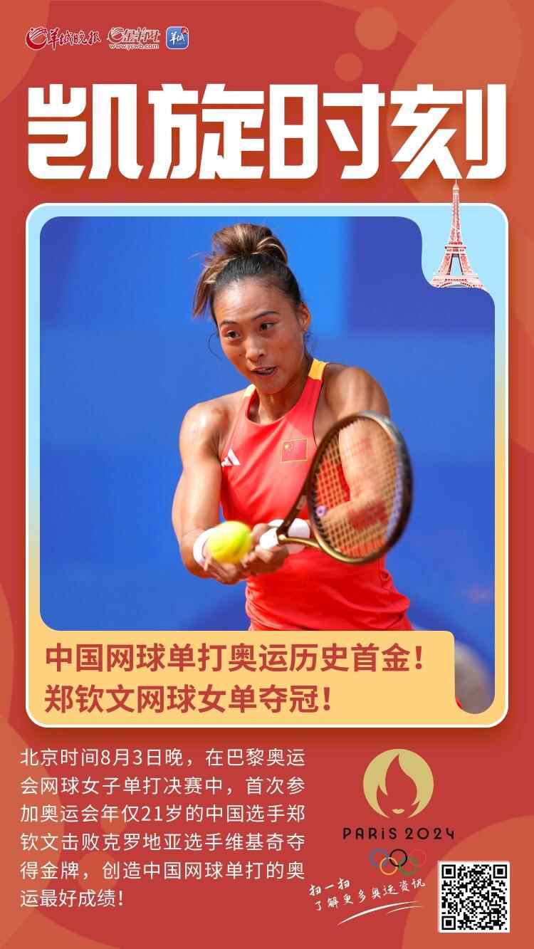 首次参加奥运会就夺得金牌,郑钦文创造了多项历史。之前,中国选手在奥运会网球项目单打的最好成绩是2008北京奥运会李娜取得的女单四强。2004雅典奥运会,李婷/孙甜甜夺得网球女双冠军,这是中国网球首枚奥运金牌。20年后,郑钦文在2024巴黎奥运会为中国网球夺得了第二枚金牌,还是含金量十足的女单金牌。
