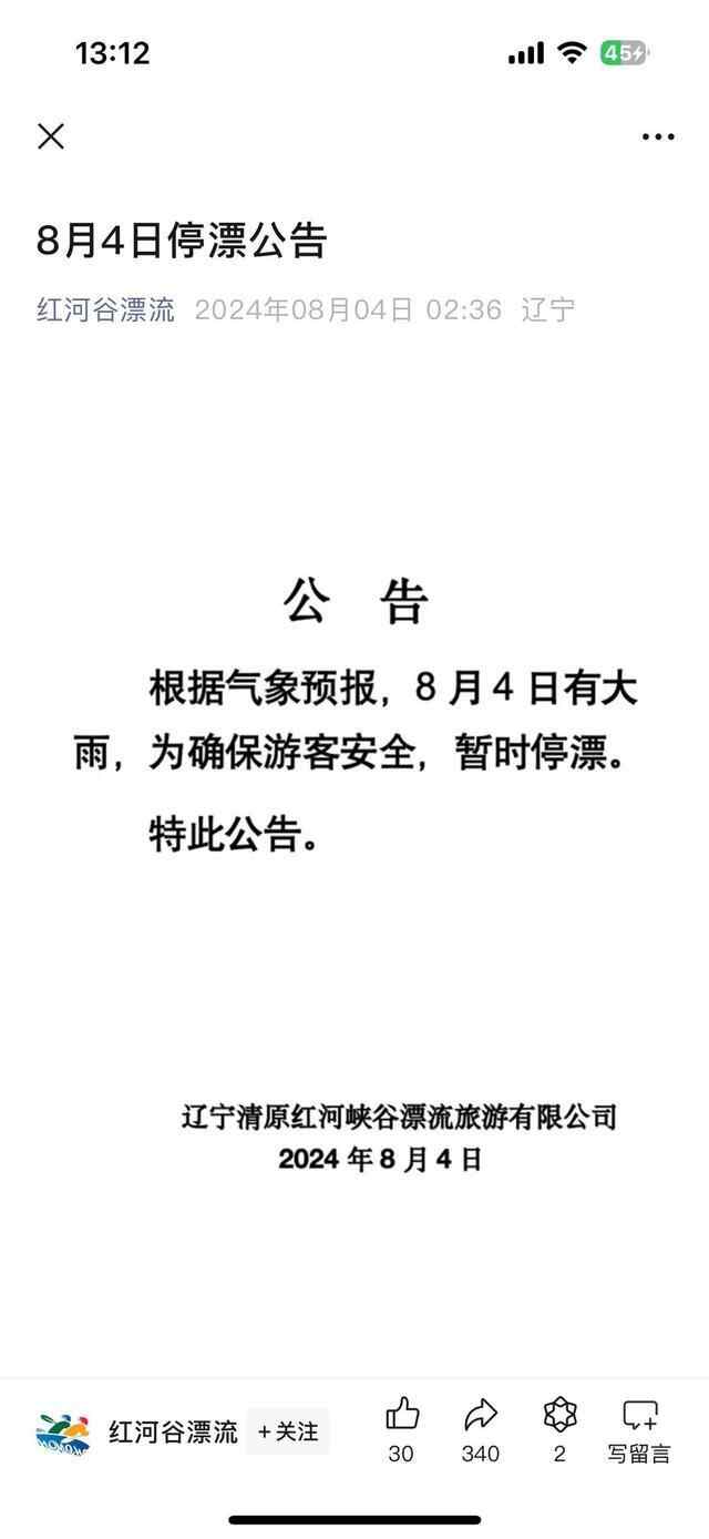 8月4日,红河谷漂流景区发布因大雨停漂公告。