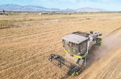 在新疆维吾尔自治区和硕县一处改良盐碱地里,大型机械在收割小麦。 新华社记者 高 晗摄