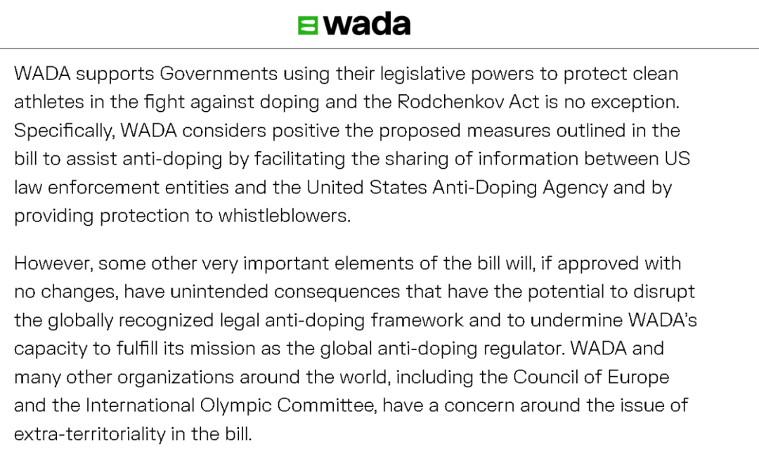 因此,世界反兴奋剂机构早在美国国会通过这个“法案”时,就公开发声明表示了反对。世界反兴奋剂机构在声明中说,他们支持包括美国在内的世界各国想要进一步打击兴奋剂使用的做法,但美国这个“法案”中长臂管辖的那部分内容,会扰乱国际认可的反兴奋剂法律框架,冲击世界反兴奋剂机构在全球反兴奋剂事业中的角色。