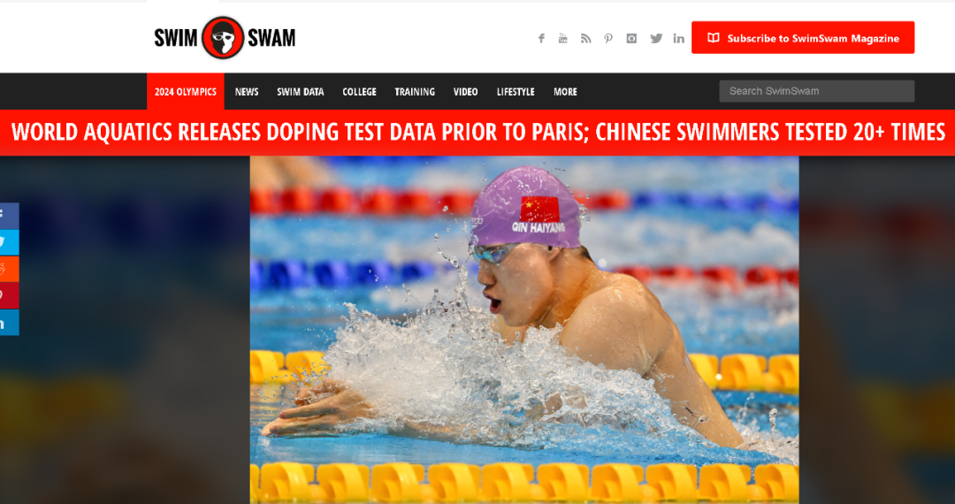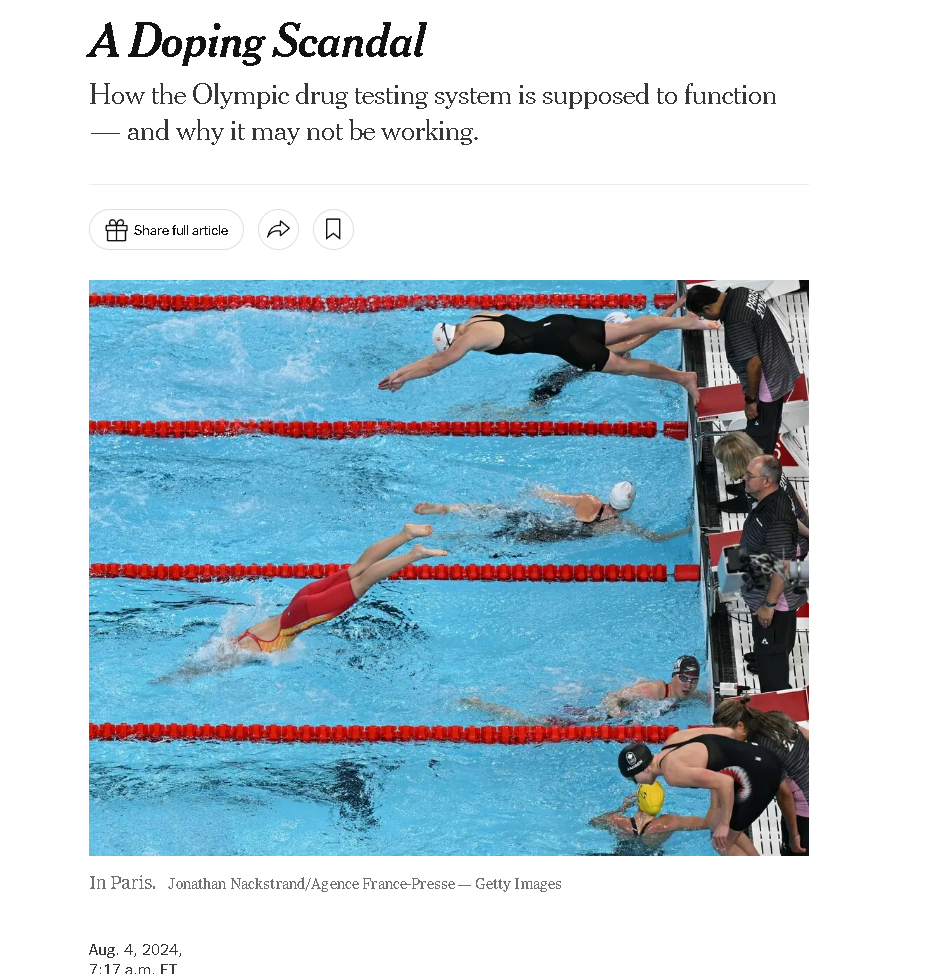 而耿直哥发现,不论是这次美联社在中国拿下4x100混合泳接力金牌后的“报道”,还是《纽约时报》、《华盛顿邮报》等美国媒体这两天攻击中国运动员和世界反兴奋剂机构的文章,还都存在着一个很讽刺的共性,就是全都闭口不谈中国运动员今年以来接受的、可以说是“巨量”的兴奋剂检测。这与这些媒体平时标榜的客观报道,显然是不符的。