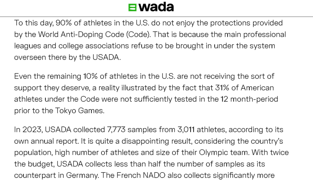 世界反兴奋剂机构在今年6月的一份公开斥责美国有关方面的声明中就列出了上述这些问题,其中还着重指出:在2023年时,美国自己的反兴奋剂机构一共从3011名运动员那里搜集到了7773份兴奋剂检测样本,但这个数字还不到德国的一半——尽管美国自己的兴奋剂检测机构的经费,是德国的两倍。