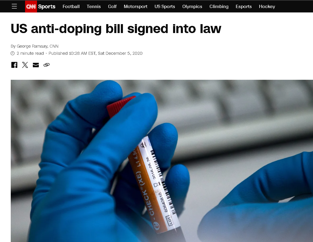 原来,大量公开资料和媒体报道显示,在2020年末,美国前总统特朗普签署通过了一项由美国国会两院通过的“法案”,该法律将允许美国政府对有美国运动员参加、或是有美国企业赞助、又或是有美国媒体报道的体育赛事中,任何被美国政府怀疑有“兴奋剂问题”的别国人员,展开刑事调查,而且一旦被美国定罪,还将面临最高10年的监禁和25万美元的罚款。虽然美国宣称这是为了在俄罗斯的兴奋剂丑闻事件后,更好的打击兴奋剂使用问题,但不少体育界人士都认为这是美国在借机公然将其“长臂管辖”的地缘政治的霸权之手,伸向体育界,以通过政治驱动的“调查”去打压不听美国话的国家。