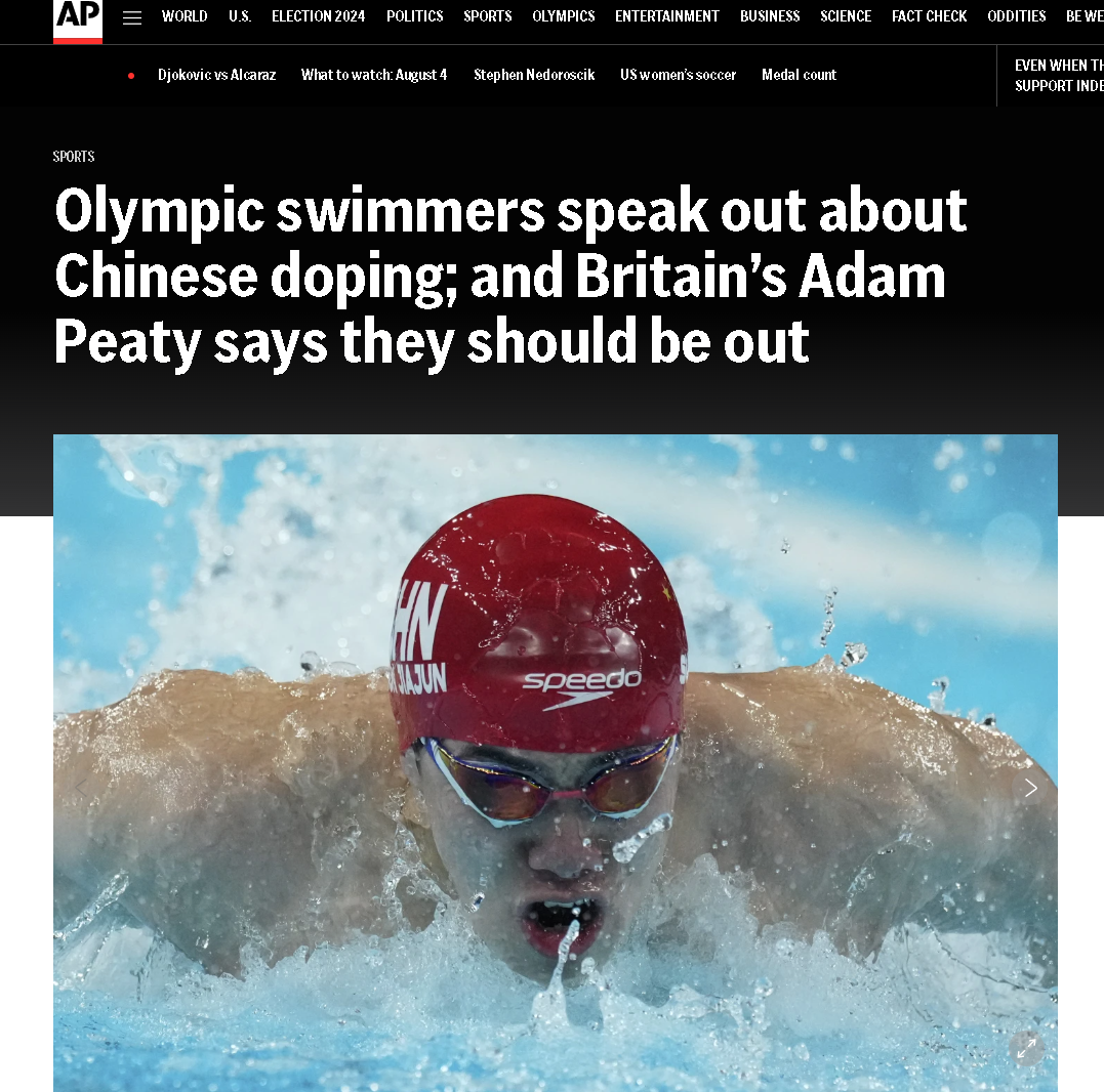 当地时间4日 ,中国游泳队4名优秀的运动员在巴黎奥运会男子4x100混合泳接力赛中反超美国,一举为中国拿下了奥运金牌后,美国的大通讯社美联社,却并没有向奥运赛场上的美国队队员那样祝贺中国运动员夺金,而是与一名在这场比赛中拿了第四名,未能登上领奖台的英国游泳运动员,“一唱一和”地再次抹黑起了中国运动员。