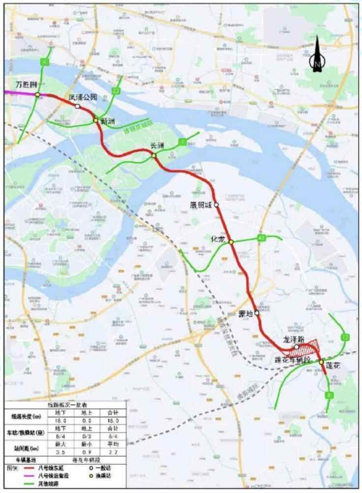 根据招标公告,广州市城市轨道交通8号线东延工程(万胜围-莲花)及同步实施工程施工总承包已由广东省发展和改革委员会批准建设,线路全长约18公里,共设8座车站,为全地下敷设线路,新建莲花车辆段。采用6辆编组 A 型车,DC1500V架空接触网供电,列车最高设计时速80公里。