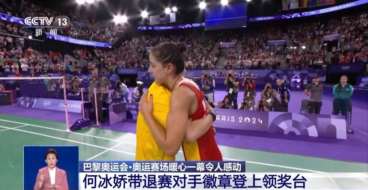 在羽毛球女单决赛中,中国选手何冰娇0∶2不敌韩国的安洗莹,收获一枚银牌。颁奖仪式上,何冰娇在举起奖牌的同时,拿出了一枚带有西班牙国旗的徽章,向半决赛中因伤退赛的西班牙名将马林送上慰问,祝愿她能够早日康复,重回赛场。运动员之间不只有竞争,也有惺惺相惜、互相尊重,这也是奥林匹克精神的一种体现。