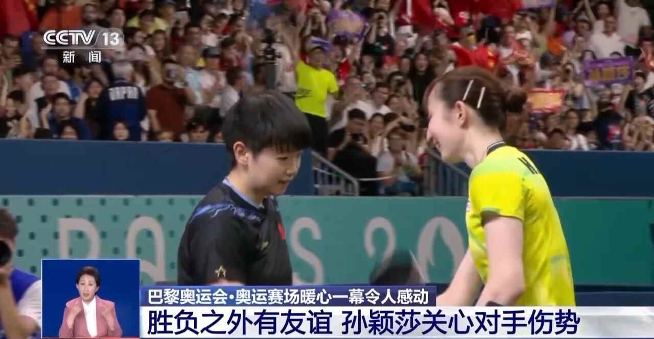 乒乓球女单半决赛,孙颖莎与日本选手早田希娜狭路相逢,技高一筹的莎莎以4∶0横扫对手晋级。比赛结束之后,孙颖莎没有庆祝就匆匆忙忙走到早田身边,关切地询问她手腕的伤势。一个小小的暖心之举,让日本女孩大受感动。孙颖莎也用自己的行动诠释了“友谊第一,比赛第二”的体育精神。