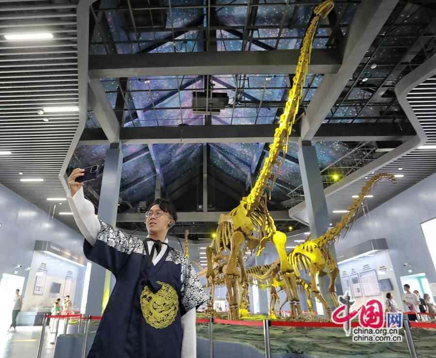 来自马来西亚的留学生张永亮在恐龙骨架模型前自拍留念。中国网记者 马旷/摄