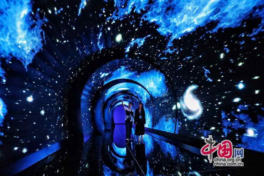 来自马来西亚的留学生张永亮(左)和来自缅甸的留学生刘彩玉(右)步入吉林市陨石博物馆,科技感满满的“时空隧道”让他们流连忘返。中国网记者 马旷/摄