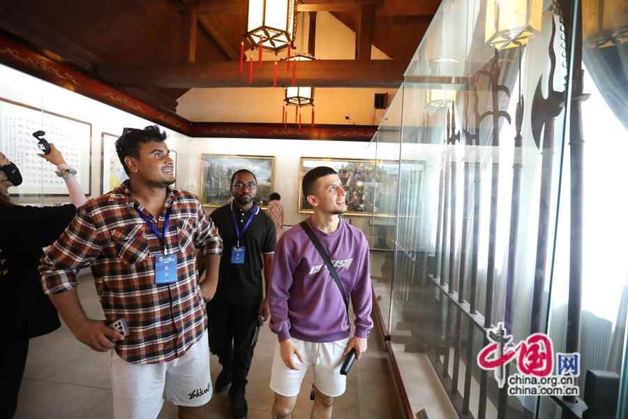 来自孟加拉国的留学生孟莱(左一)与小伙伴们被中国古代打仗时使用的兵器所吸引,停在展柜前研究了很久。中国网记者 马旷/摄