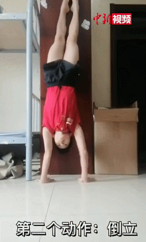 第二个动作:倒立。一共3组,每组1分钟。对于跳水运动员来说,倒立是基本功,训练上肢力量。如果运动员的上肢力量不够,入水的瞬间双手就会被水冲开,影响入水效果。