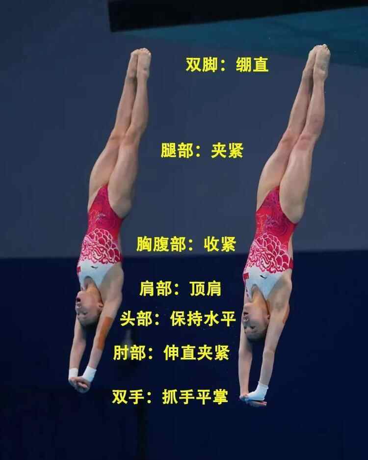 “简单来说,就是运动员身体要与水面垂直入水。具体要求有手臂贴紧双耳,头、肩膀到脚尖成一条直线,在手掌接触到水面的一瞬间,身体最好是与水面成90度的直线,腰不能松,臀部要夹紧。”
