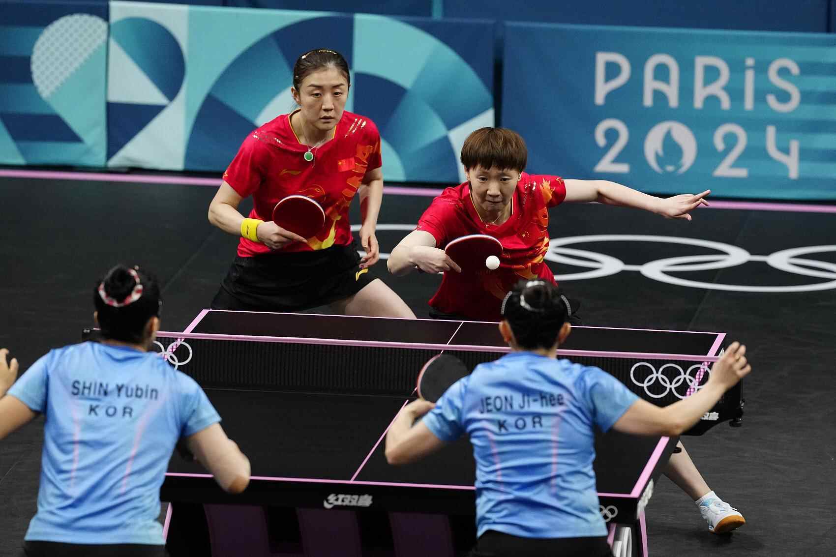 8月8日的半决赛,第一盘女双由陈梦/王曼昱对阵申裕斌/田志希,韩国女双抢攻积极却难以得分,中国女双用稳定而高质量的防反迅速拉开分差,以11比4、11比5拿下前两局。被逼到绝境的申裕斌/田志希,第三局更为坚决地拼抢攻,以11比9扳回一局。第四局轮到陈梦/王曼昱更积极地抢攻,对拉中几个关键球都抢攻得手,结果以11比9结果了第一场对决。