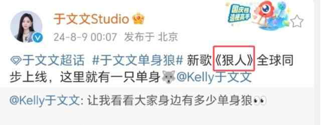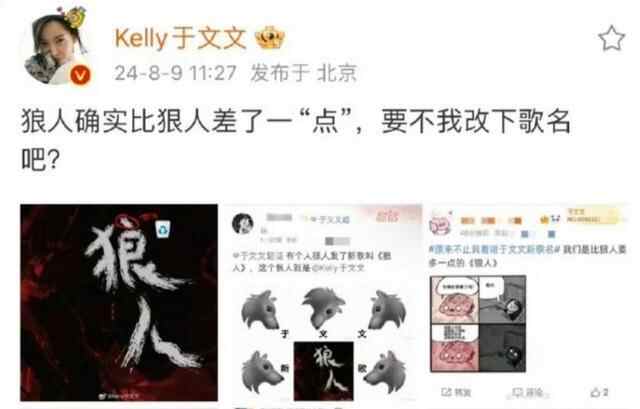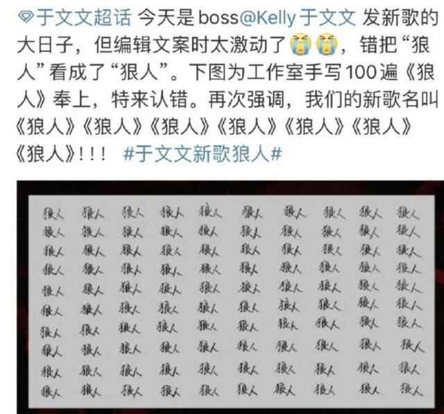 8月9日,于文文新歌《狼人》上线,让人想不到的是,工作室在转发于文文本人微博时,居然把“狼”写成了“狠”,网友戏称新歌7分钟被迫改名”。