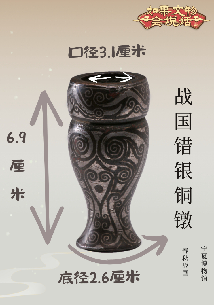 战国错银铜墩,呈细腰圆筒形,上端有銎,可装入戈、戟的木柲,在其外表及底部,用细小的银片和银丝镶嵌,构成布局完整的卷云纹及曲线图案,然后磨平。由于铸成镦的青铜和嵌入的银片、银丝两种金属的光泽不同,器物上的图案银光灿灿、绚丽多姿,格外夺目。