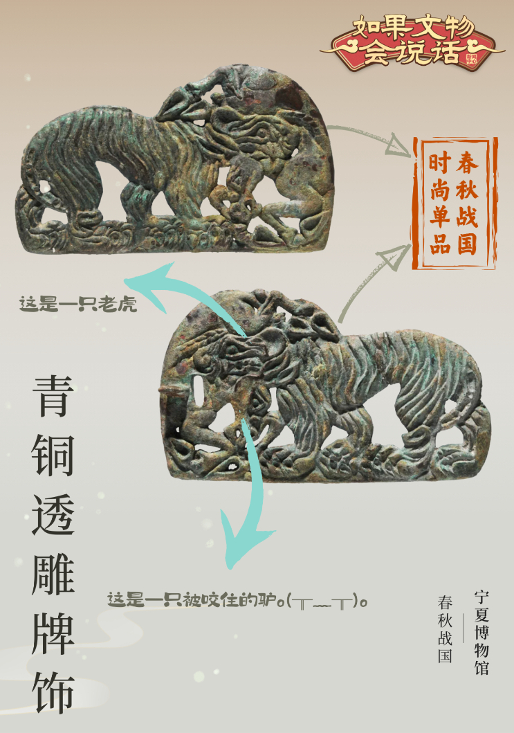牌饰巧妙结合虎和驴的体形、神态,设计充满了雄浑的野性美,极具北方游牧民族特色。这件牌饰工艺简练,雕刻精巧,反映出当时精湛的铸造技术和丰富的青铜文化,是中国北方青铜文化的重要组成部分。为研究宁夏地区古代游牧民族文化提供了重要实物。