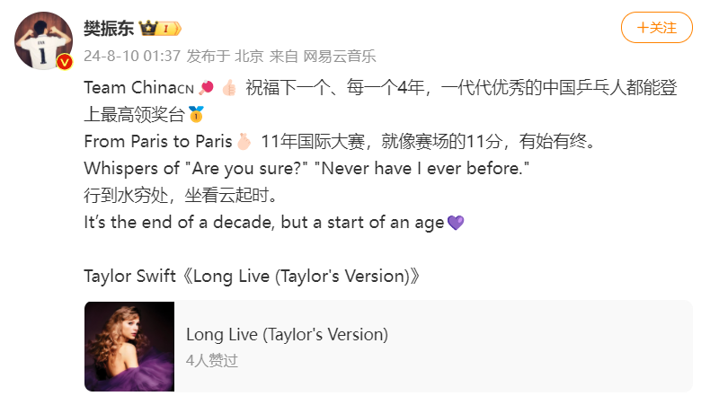 8月10日,樊振东在微博发文冲上热搜第一。