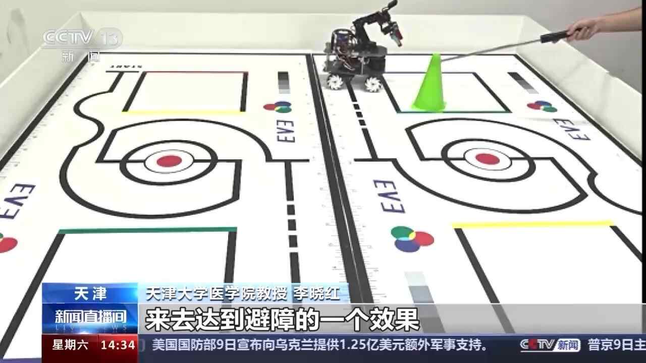 天津大学医学院教授 李晓红:它是可以通过去控制左轮和右轮的一些速度,它的一些方向,它的一些角速度来达到一些避障的效果,就是我们第一个完成的一个任务;第二个是我们还可以实现跟踪;第三个是可以实现抓取。