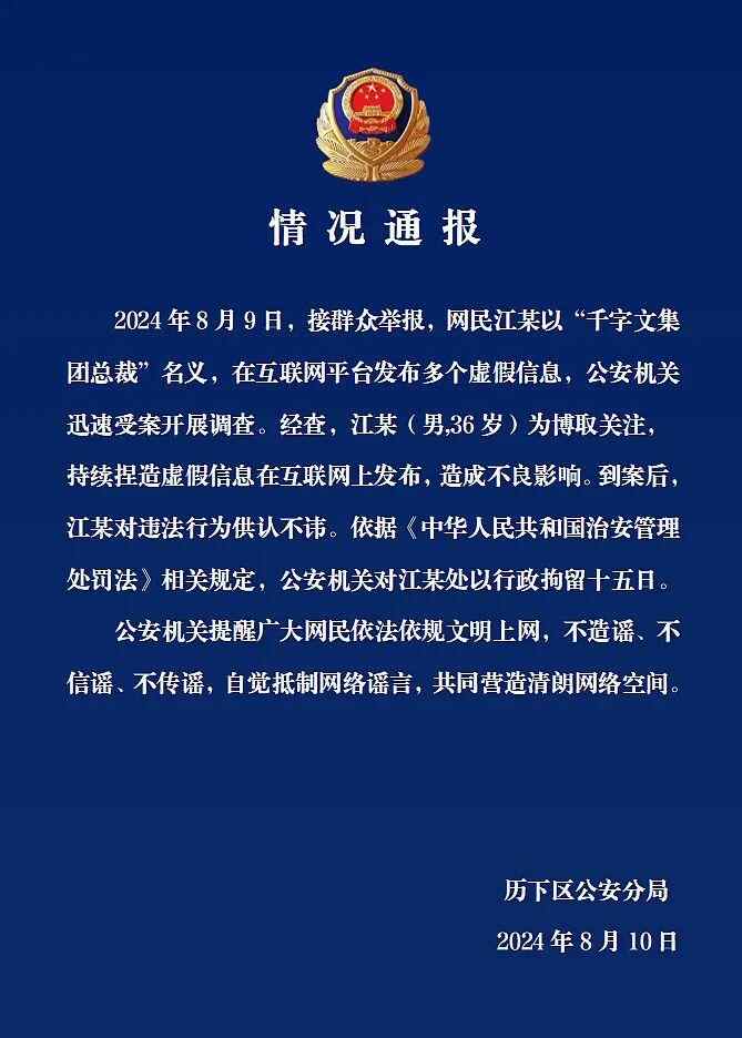 8月10日,济南市公安局历下区公安分局发布通报。通报显示,因持续捏造虚假信息在互联网上传播,江杰被行政拘留15天。
