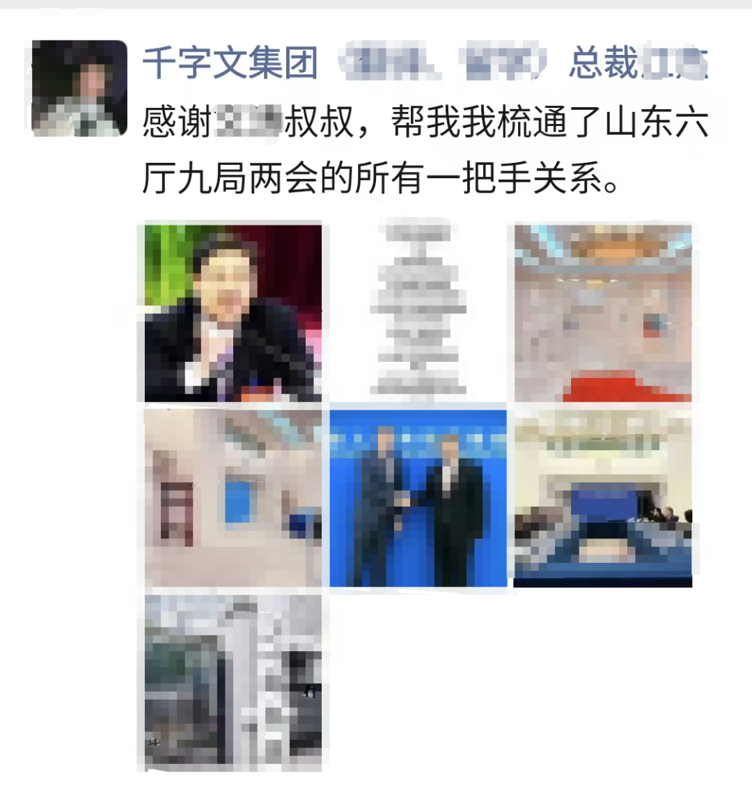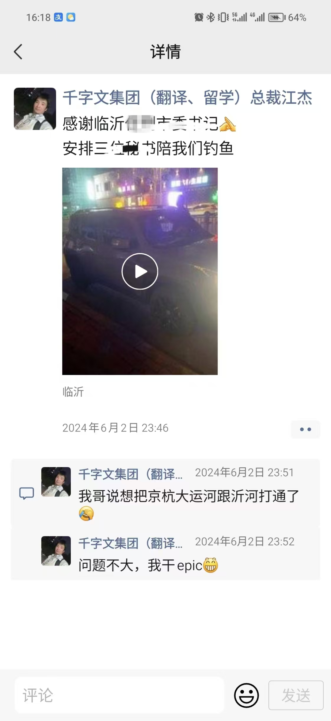记者注意到,在微信朋友圈截图中,江杰给自己备注的头衔为:千字文集团(翻译、留学)总裁。在过往和最近的微信朋友圈中,江杰格外突出他与山东省及临沂、日照等一些前任、现任领导的关系,诸如某厅长是他哥哥等。此外,他还特别晒出他出入高级娱乐场所、使用豪车等照片,同时强调某区区长派三个安保人员陪他,某地书记派三名秘书陪他钓鱼等等。
