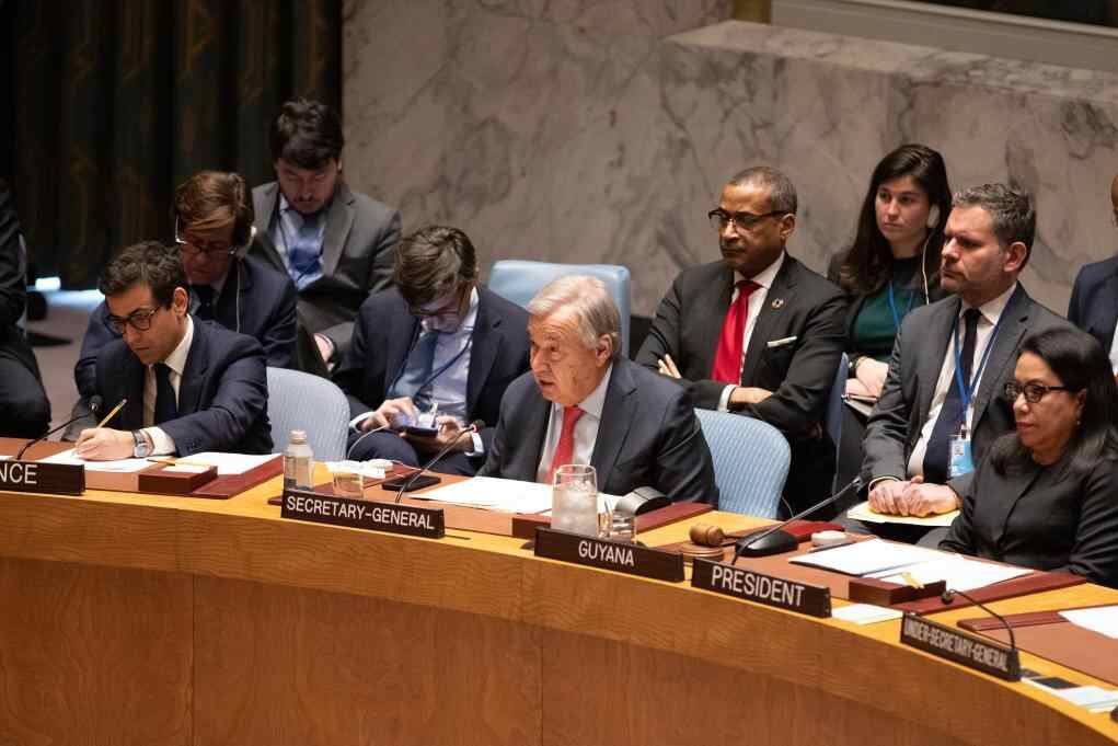 2月23日,在位于纽约的联合国总部,联合国秘书长古特雷斯(前排中)在乌克兰问题高级别公开会上发言。乌克兰危机升级两周年之际,联合国安理会23日举行乌克兰问题高级别公开会,与会多方呼吁通过政治手段解决乌克兰危机。新华社记者谢锷摄