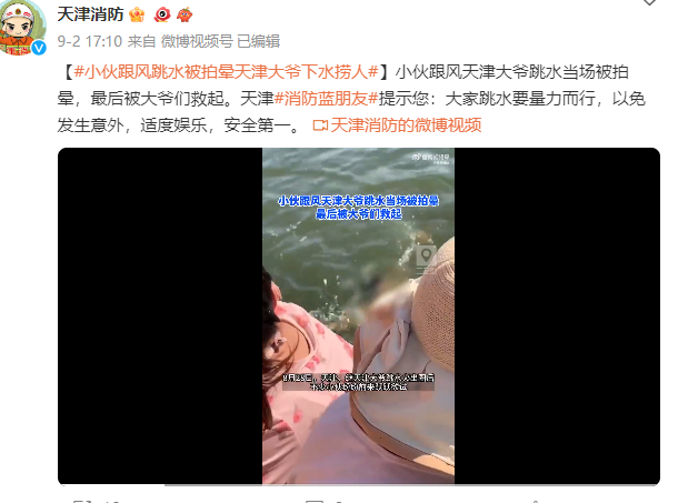 不过,随后跟风模仿者也人越来越多,天津消防连续接到,有人跳水直接被拍晕的警情,并在第一时间发出通报。