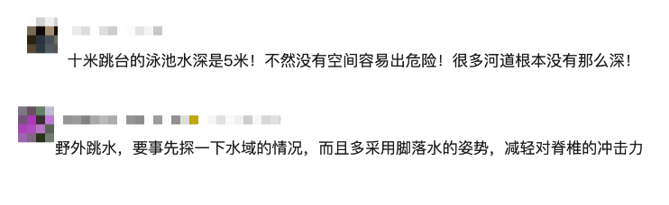此外,据四川省乐山市人民医院,近日,15岁的小张和同伴相约河边游泳,见到小伙伴们先后跳水一展英姿,小张也萌生了跳水的念头。他在河边一跃而下后,头颈部撞到河床,整个人几乎失去活动能力,被救上岸后立即到医院急救。