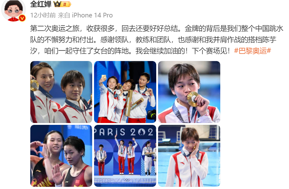 8月11日,全红婵发微博告别巴黎,“第二次奥运之旅,收获很多,回去还要好好总结。金牌的背后是我们整个中国跳水队的不懈努力和付出。感谢领队,教练和团队,也感谢和我并肩作战的搭档陈芋汐,咱们一起守住了女台的阵地。我会继续加油的!下个赛场见!”