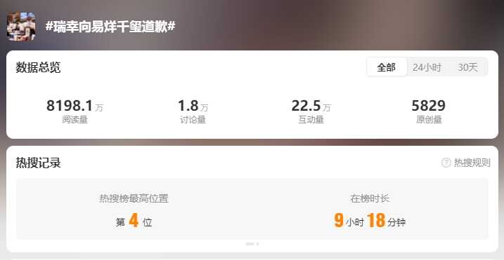 据媒体报道,当晚“瑞幸致歉信”相关词条冲上微博热搜。截至发稿时,“瑞幸向易烊千玺道歉”话题热搜榜最高位置第4位,阅读量8198.1万。