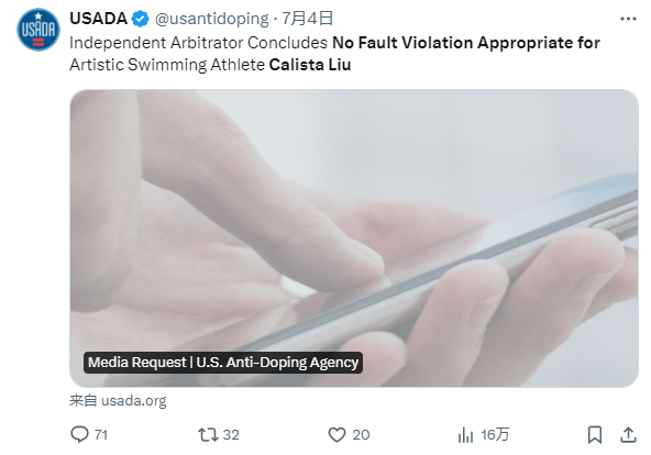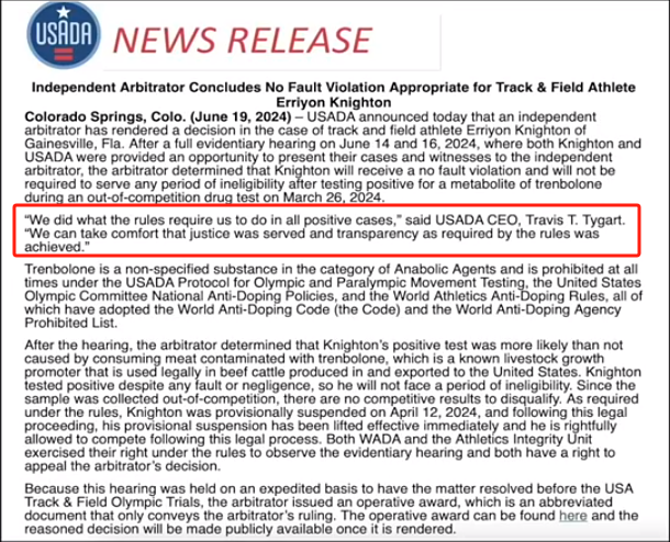 这届奥运会,享受了美国这项“服务”的除了花游运动员卡莉斯塔,还有田径运动员埃里扬·奈顿。他们分别在5月和3月药检阳性,但巧的是,美国官方对这两人的脱罪声明都是卡在奥运会前发出,“及时”地保住了他们的参赛资格,然后美国反兴奋剂机构官网又“及时”地把声明删掉了。