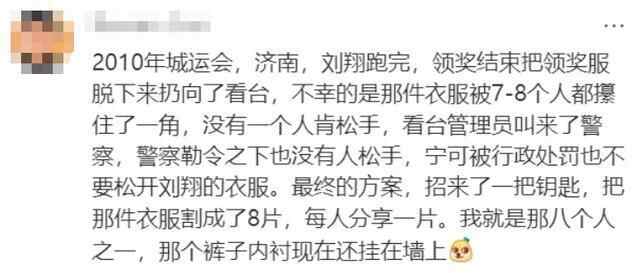 随后,那名“八分之一”网友讲述了事情的经过。2009年全运会在山东济南举行。刘翔夺冠后,脱下比赛服扔向看台,之后把裤子也脱了下来抛给观众。就在该网友幸运地抓到这条裤子的同时,还有另外7人也抓住了,他们谁都不愿意松手。最后这条“幸运裤”被人用钥匙割开,分给了抢到的8个人。该网友表示,他至今还珍藏着这八分之一的裤子。这个看似离谱的故事背后是大家对于刘翔的喜爱。