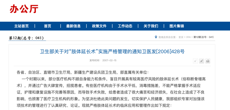 早在2006年,原卫生部就下发了《关于对“肢体延长术”实施严格管理的通知》,明确规定我国实施该技术的适应症为先天畸形、外伤、肿瘤、感染等原因所致的骨缺损或肢体不等长,以及因疾病引起的肢体畸形,并严禁用于医疗美容项目。