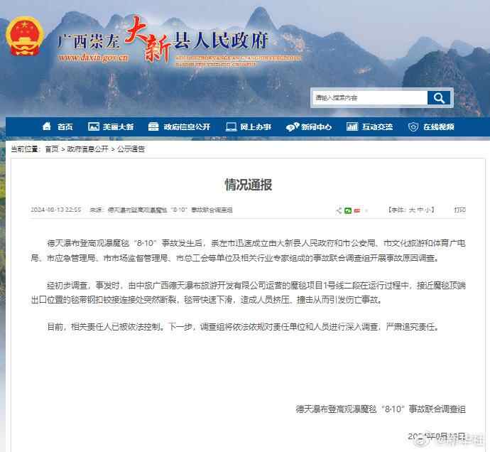 广西德天瀑布登高观瀑魔毯“8·10”事故联合调查组13日发布初步调查结果: