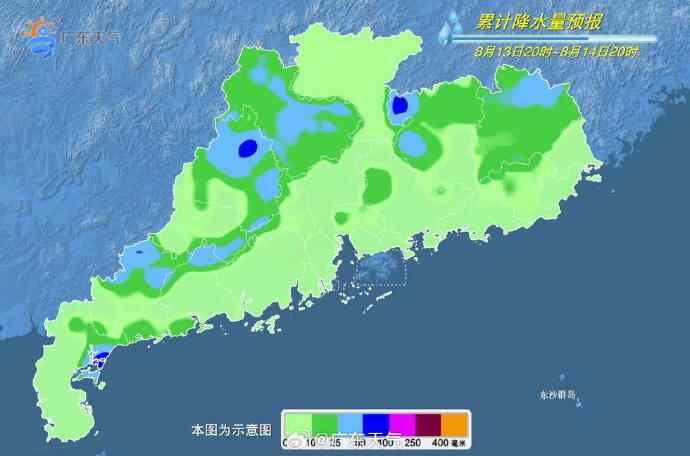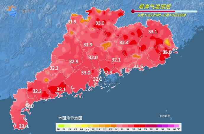 14日,广东省大部有中到大雨,局部暴雨或大暴雨。大部分市县最高气温32℃~35℃。
