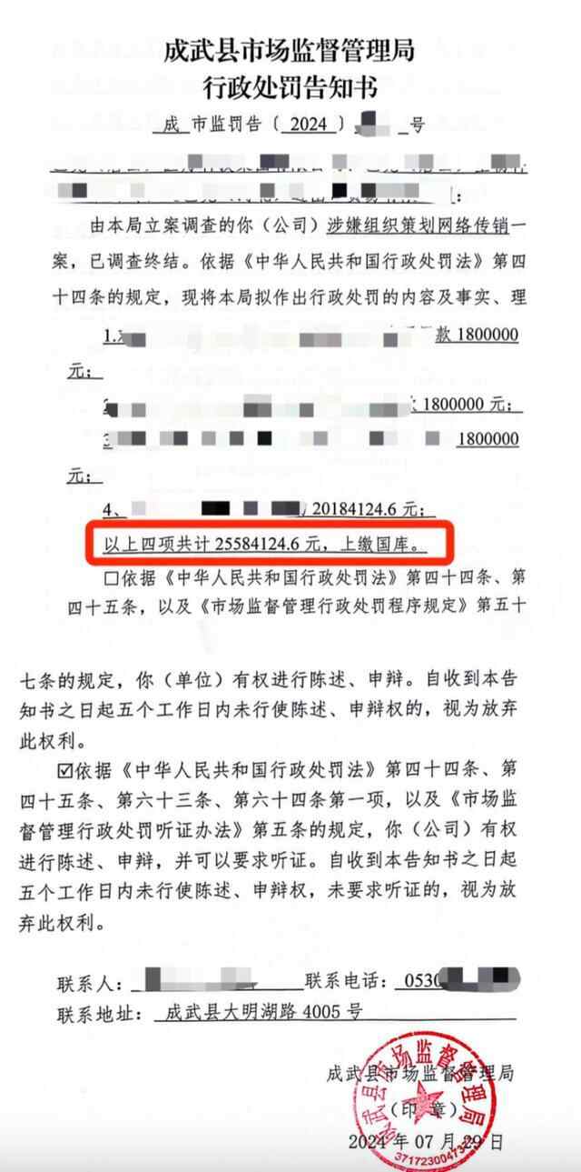 记者了解到,该事件与成武县市场监督管理局调查的一起涉嫌网络传销案有关。据2024年7月29日,成武县市场监督管理局作出的《行政处罚告知书》显示,除没收违法所得外,市场监督管理局还对3家涉事企业进行了共计540万元的处罚。
